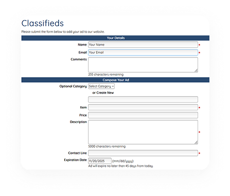 Members can post items for sale or a service, with price, description and contact information as a Classified Ad.