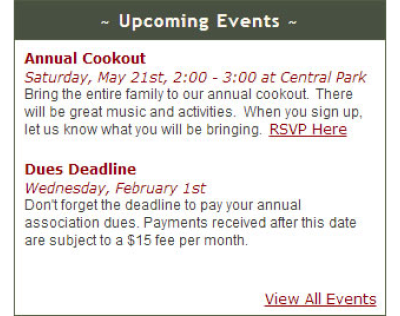 The Mini View feature is great for posting the newest and most relevant information so that visitors can see a snapshot of many of the website’s pages in a single view. Visitors can then click a link within each Mini View for the full details. Choose from features such as announcements, news, upcoming events, surveys, homes for sale and many more. It is up to you what content you put on your website. So, feel free to include any other content boxes that fit your needs. Choose for each box individually if the visitor must have one of the required access levels in order to see the contents within the box.